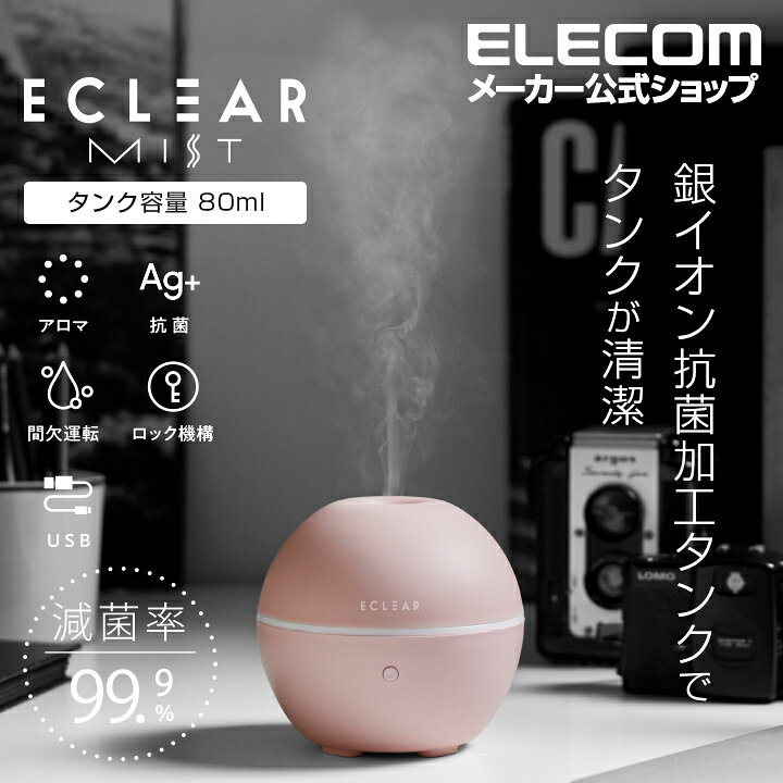 ■ミスト方式:超音波振動方式■定格電圧:DC5V■定格電流:830mA■消費電力:約4W■給電方法:USB(Micro-Bメス)■水タンク容量:約80ml■連続動作時間:最大7時間■寸法:約φ112mm×高さ103mm■質量:約160g (専用USBケーブルを除く)■抗菌仕様:銀系無機抗菌剤 SIAAマーク取得 JP0122130A0004O■抗菌箇所:水タンク・内カバー■グラデーションカラー:白、赤、紫、青、淡青、緑、黄■使用環境温度:10℃〜40℃■カラー:ピンク■内容物:本体×1、取扱説明書×1、専用USBケーブル約100cm×1■保証期間:1年エレコムダイレクトショップメーカー希望小売価格はメーカーサイトに基づいて掲載しています。