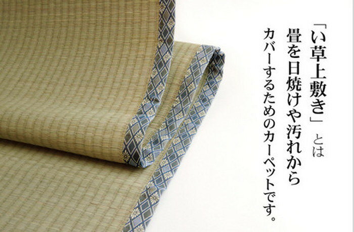 商品説明(spec等)サイズ・カラー三六間3畳 182×273cm素材素材:い草(九州産) ※糸引織 ヘリ=ポリプロピレン、ポリエチレン生産地日本商品説明上敷きを敷くだけで畳のお部屋をリフレッシュ出来ます。
