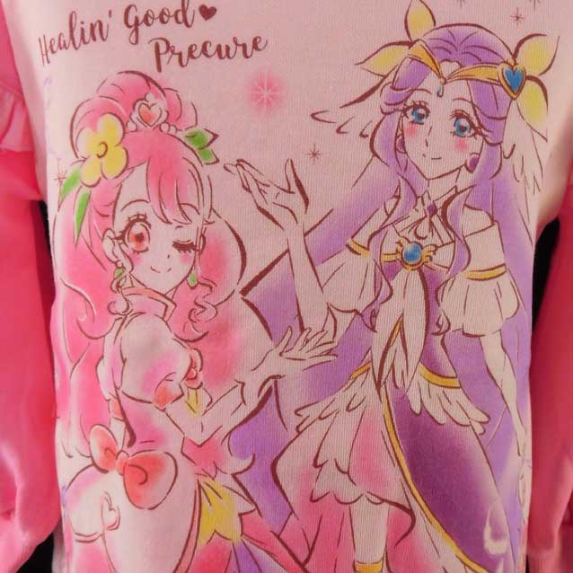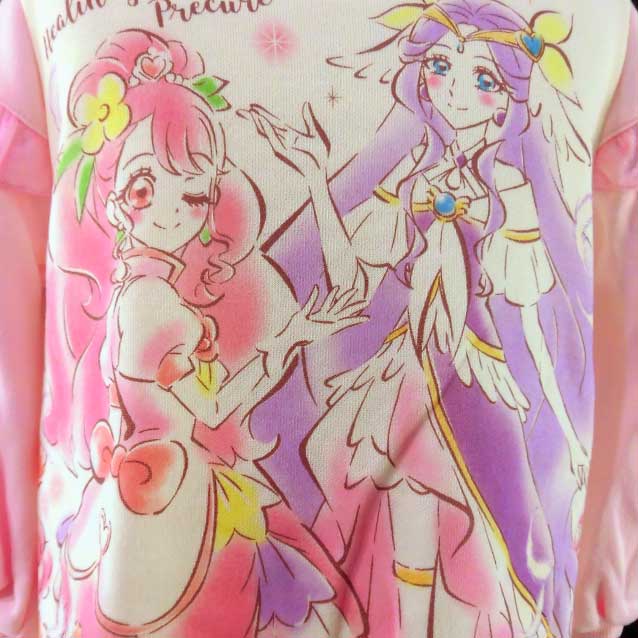 女の子に大人気! トップスフロントにはキュアグレースとキュアアースのツーショット淡い色使いがキュート 袖肩のフリルはベロアで高級感あり! さらにこのパジャマは「光るパジャマ!」 光るパジャマとは 明るい所で光りを溜めておくと 暗い所で蓄光プリントが光る こども達にもママパパにも大人気のパジャマです。